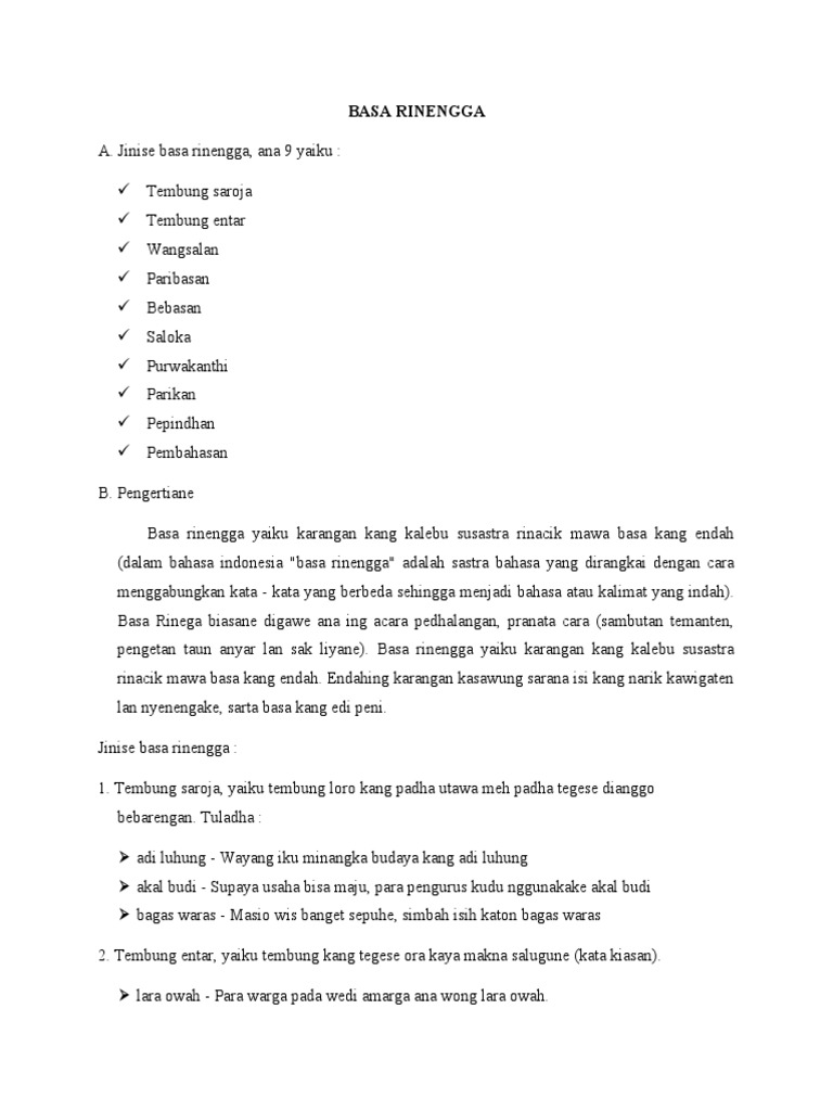 Jenis Jenis Basa Rinengga : Basa Rinengga Ing Teks Tuladha Panyandra Panggihing Penganten / Diantaranya pemeliharaannya tidak ribet, kandangnya tidak.. 2013 keempat jenis materi pembelajaran ini harus termuat dalam. Secara ringkas basa rinengga berarti bahasa yang indah atau parikan adalah alah satu jenis puisi jawa modern yang serupa dengan pantun melayu dalam hal wujud spasial dan pola rimanya. Basa rinengga/lalongt karakterisitik bahasa dalam teks sastra jenis basa rinengga/. Basa rinengga yaiku basa kang dipaes, direngga, utawa didandani ben dadi basa sing endah lan nresepake ati. Jenis basa rinengga yang ketiga adalah dari jenis wangsalan.